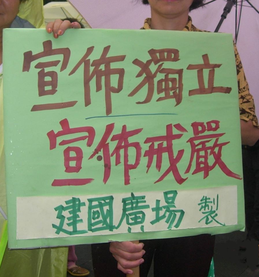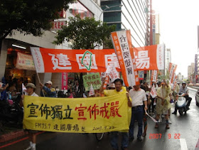 我們建國廣場在2007年9月22日在台北市舉辦一場遊行,主題叫做「宣布獨立,宣布戒嚴」。所謂宣布獨立,當然是執政者宣布,不是我們建國廣場宣布。我們認為用街頭革命(在野革命)的方式台獨建國,不大可能,不如獨派強人合法當選執政之後,推動台獨革命,變法建國,比較有可能。因此,我們呼籲以執政革命,宣布獨立的方式來完成台獨。那場遊行也順便提醒當時任期所剩不多的總管陳水扁,如果他有種,他可以為台獨做最後一搏。當然,我們不敢奢望。遊行規模小,陳水扁應該不知道這場遊行,即使知道,他也不會鳥我們的訴求。