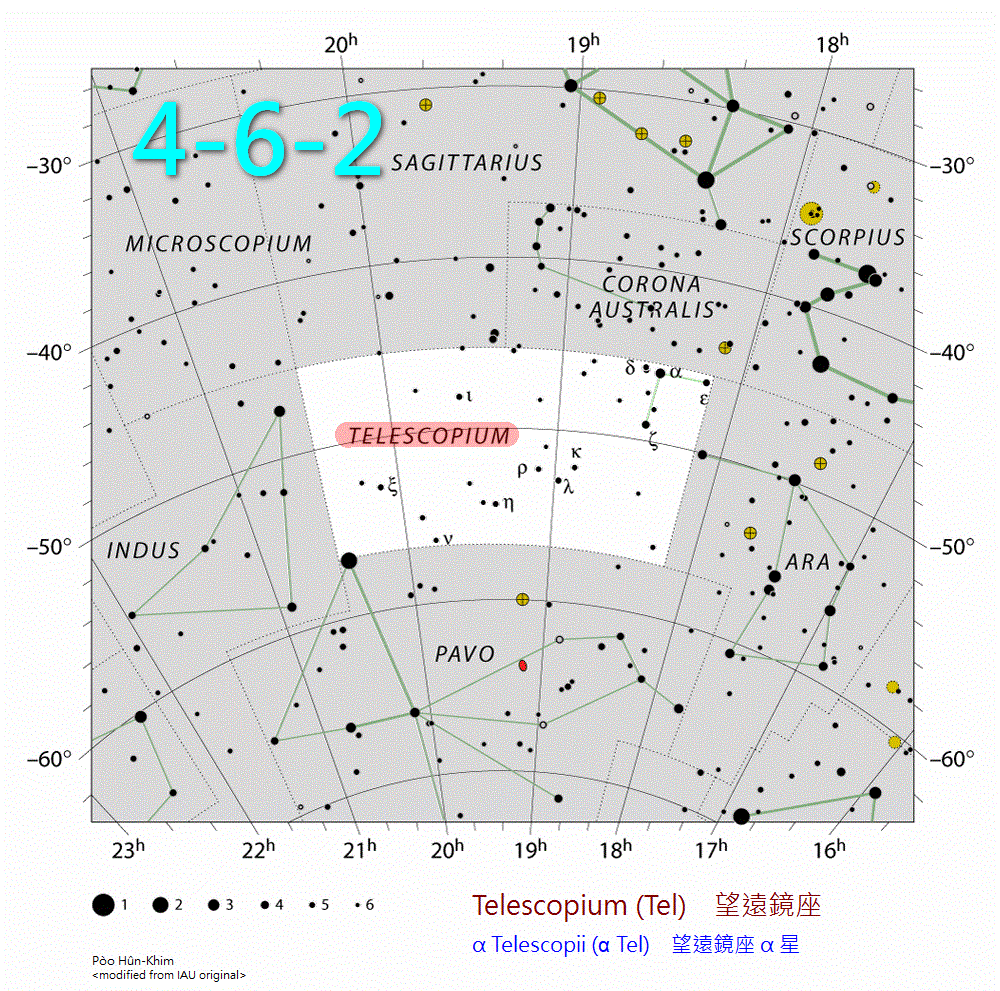 | 4-6-2 | Tel | Telescopium /ˌtɛliˈskoupiəm/ | 望遠鏡座 | bōng-uán-kiànn-tsō | α | Tel | Alpha | Telescopii /ˌtɛliˈskoupi.ai/ | |||